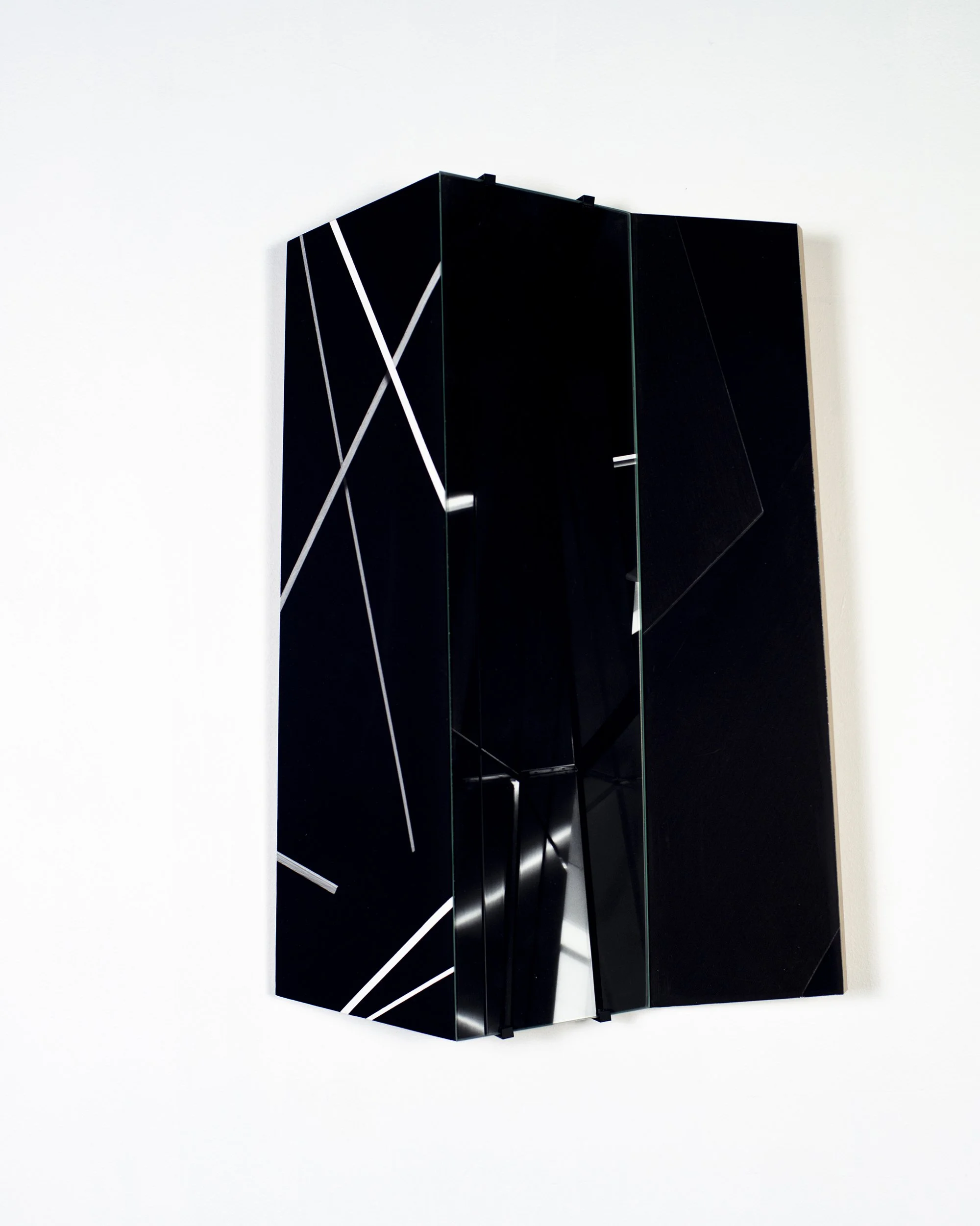 Constructions- Folds (2022) is a series of wall sculptures (20” x 15” x 4” approx.) built from plywood, inkjet photographs printed on vinyl, colored acetate film on glass and metal brackets. The sculptures combine photographs of architecture with images of abstract, provisional constructions photographed in the studio.